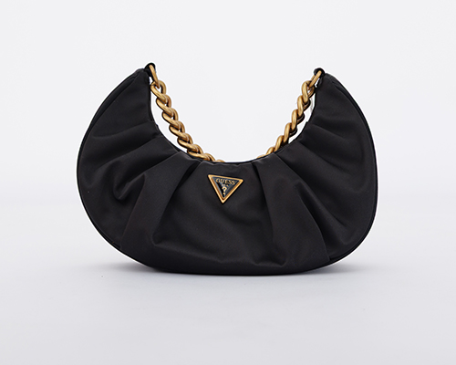 Černá kabelka s matným zlatým logem a výrazným uchopem v provedení masivního řetězu