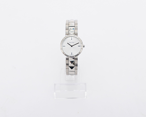 Dámské elegantní hodinky CK, stříbrné, řemínek s pyramidami