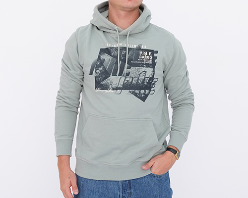 Pánská mikina mintové barvy s kapucí a velkou kapsou na přední straně