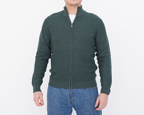 Páský svetr, značka M.X.O. zelený strukturovaný vzor, model se stojáčkem na zip