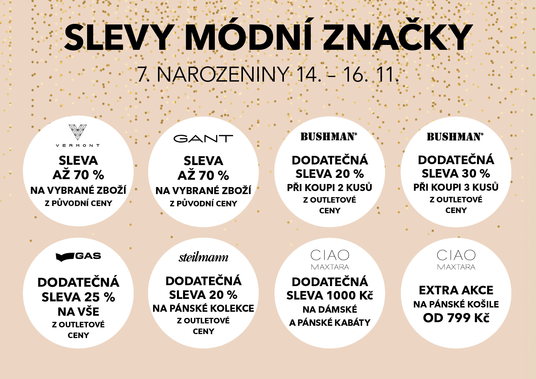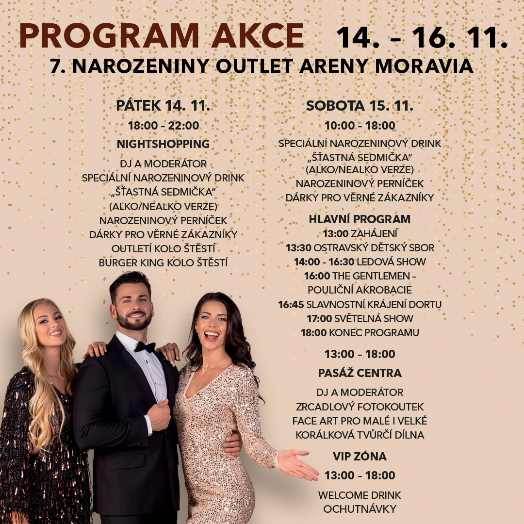 Możesz się już cieszyć. Tak jak co roku, również i tym razem chcemy świętować nasze urodziny z tymi, których kochamy, dlatego zapraszamy Cię na uroczystości. Przyjdź i świętuj z nami 7. urodziny Outlet Arena Moravia w weekend 14–16 listopada.